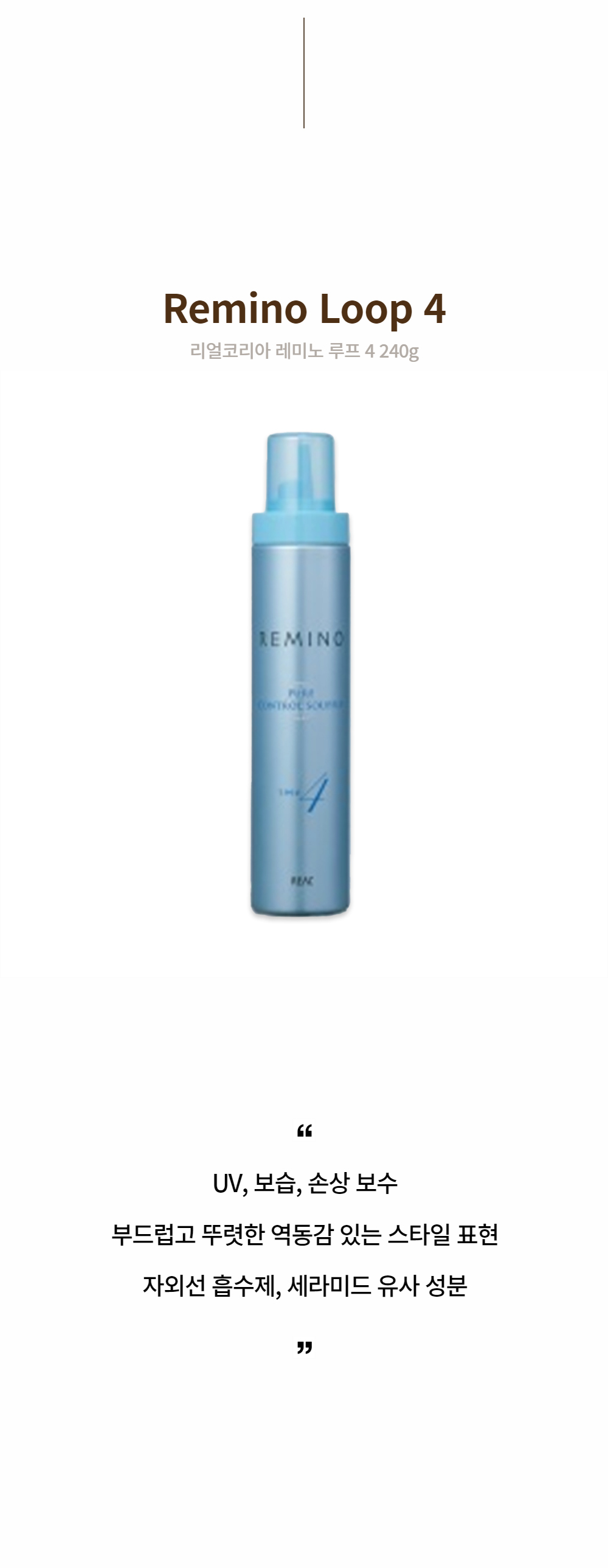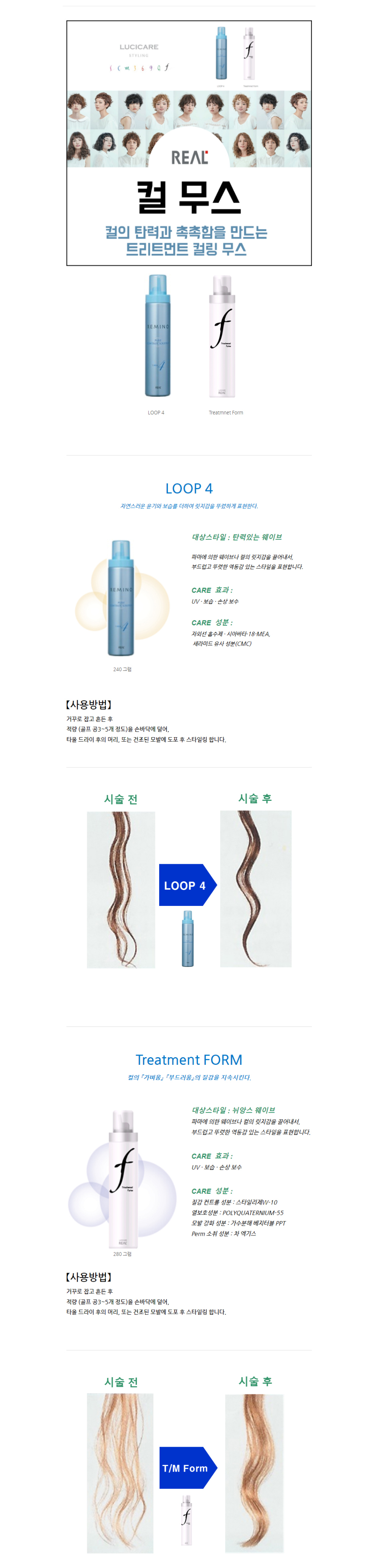 | 제품특징 | UV, 보습, 손상 보수 부드럽고 뚜렷한 역동감 있는 스타일 표현 자외선 흡수제, 세라미드 유사 성분 |